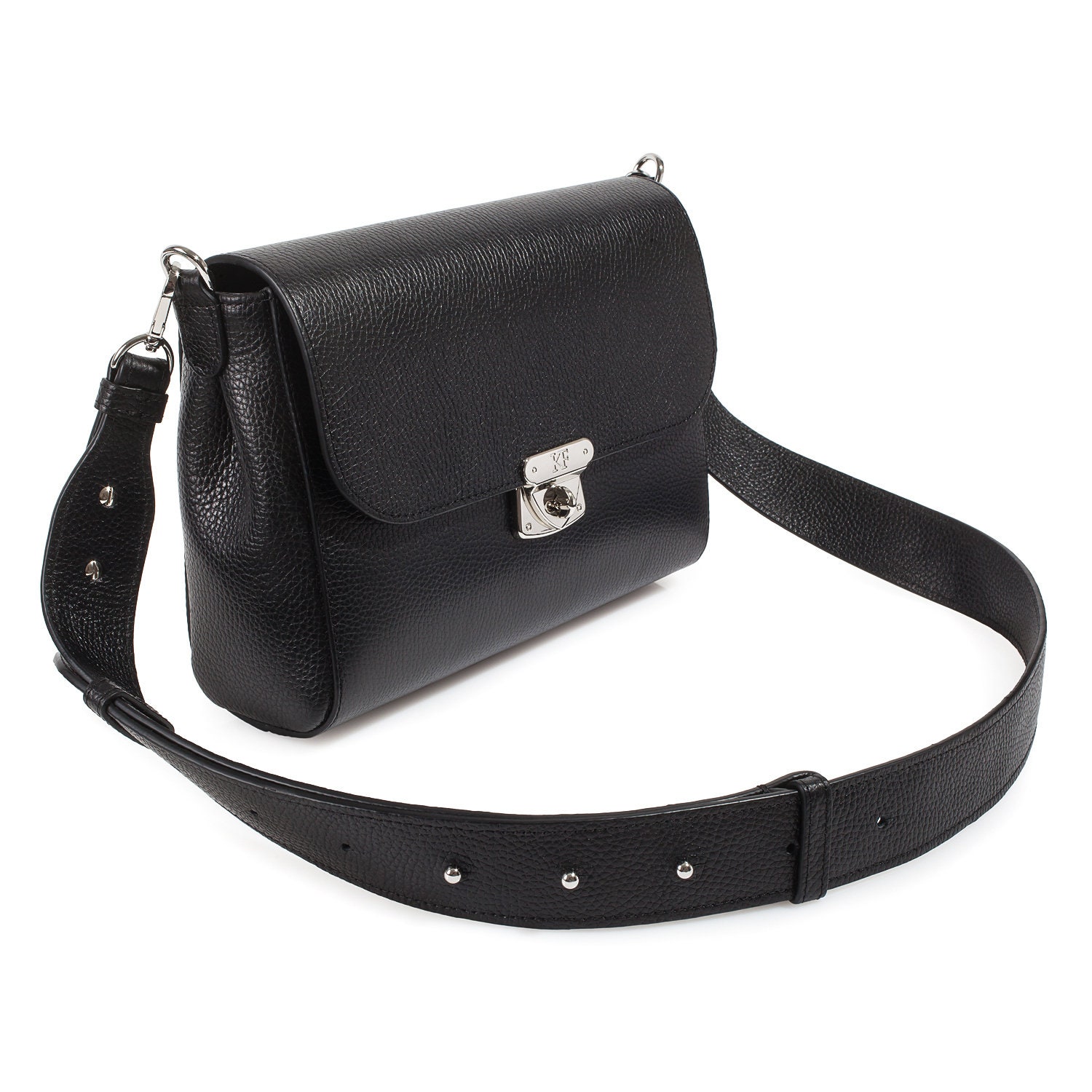 Black genuine leather woman shoulder bag from ukrainian designer Katerina Fox. Fashionable and elegant modern bag KF for bright girls and women. This bag is able to attract attention and highlight your exquisite taste. The internal space of a bag is equipped with one spacious compartment and one patch-pocket. The bag is closed with a clasp. There is a long handle that allows you to wear the bag on the shoulder. The kit also includes a storage bag.