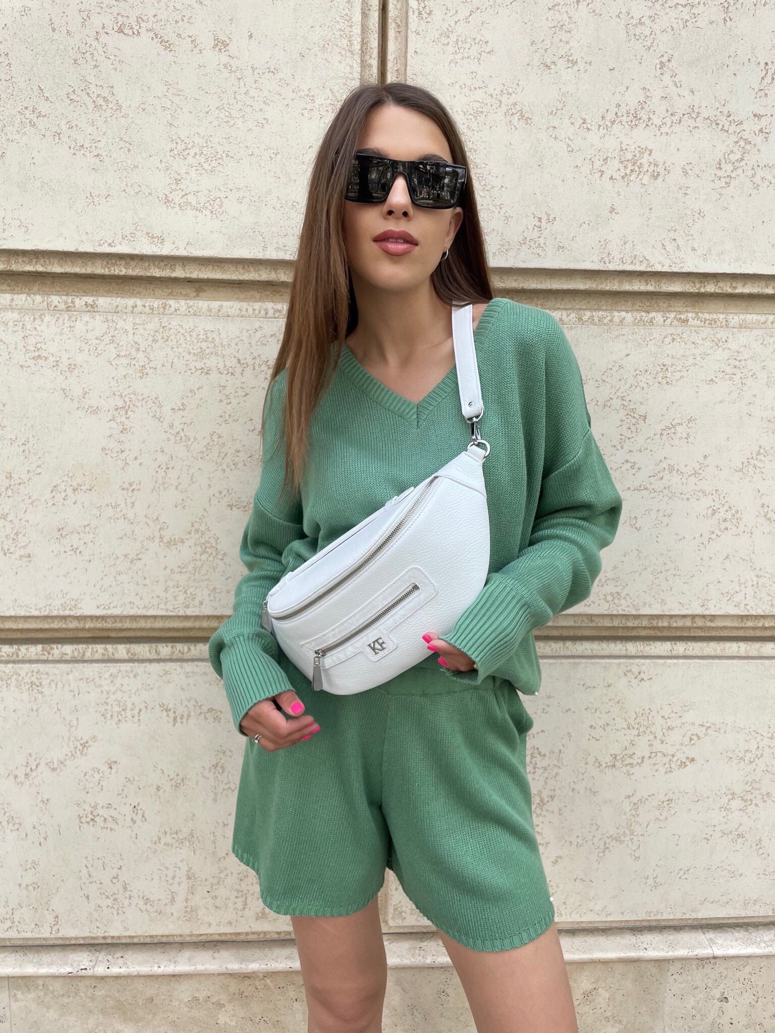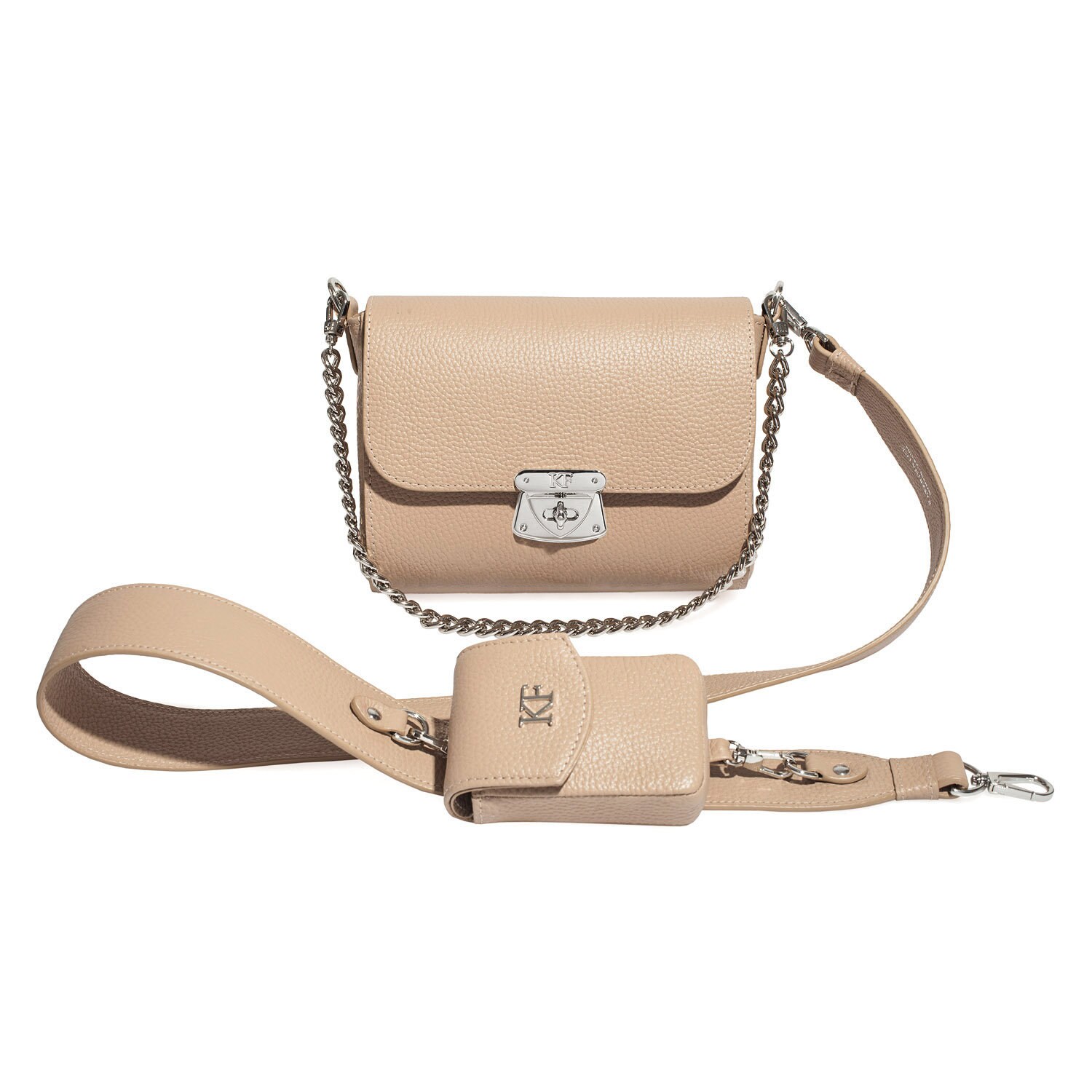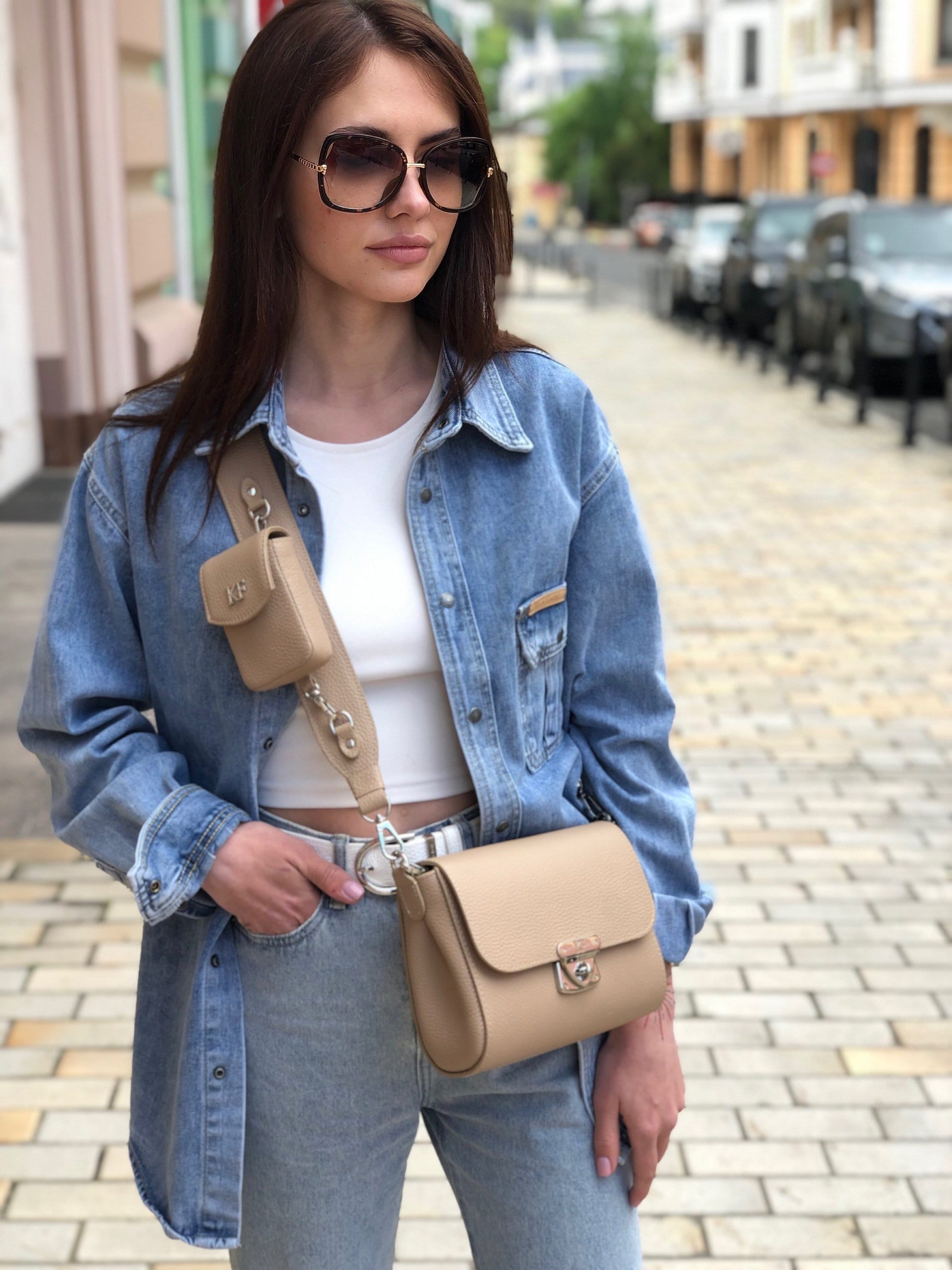 Beige genuine leather woman shoulder bag from ukrainian designer Katerina Fox. Fashionable and elegant modern bag KF is made in a soft cream color with gold trim and accessories. A great combination is able to attract attention and highlight your exquisite taste. Inside the bag one large compartment, one patch pocket and one zipper pocket, bag closes with a zipper. The handle length is adjustable.