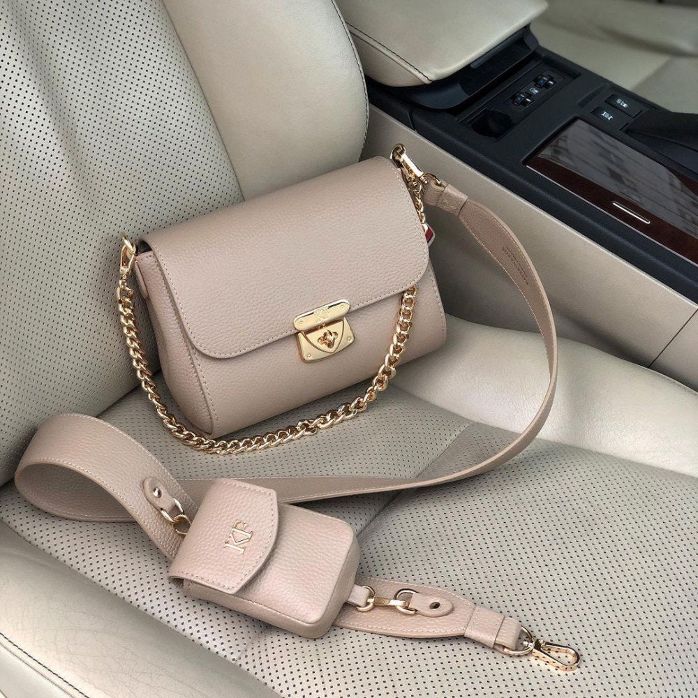 Beige pearl genuine leather woman shoulder bag from ukrainian designer Katerina Fox. Fashionable and elegant modern bag KF is made in a soft cream color with gold trim and accessories. A great combination is able to attract attention and highlight your exquisite taste. Inside the bag one large compartment, one patch pocket and one zipper pocket, bag closes with a zipper. The handle length is adjustable.