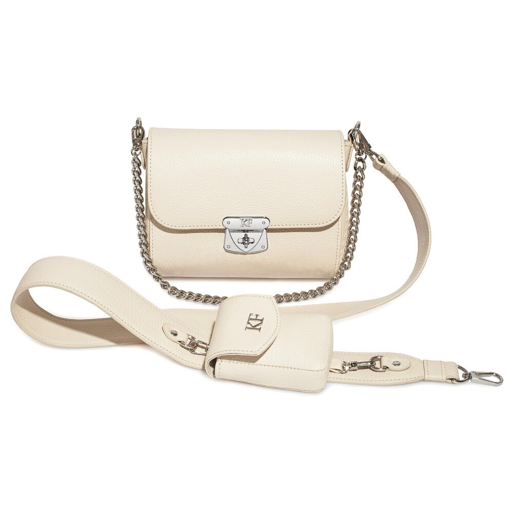 Beige genuine leather woman shoulder bag from Ukrainian designer Katerina Fox. Fashionable and elegant modern bag KF for bright girls and women. This bag is able to attract attention and highlight your exquisite taste. Inside the bag is one large compartment and a convenient zippered pocket for small items, closes the bag on the clasp. The bag is comfortable to wear on the shoulder or across the shoulder.