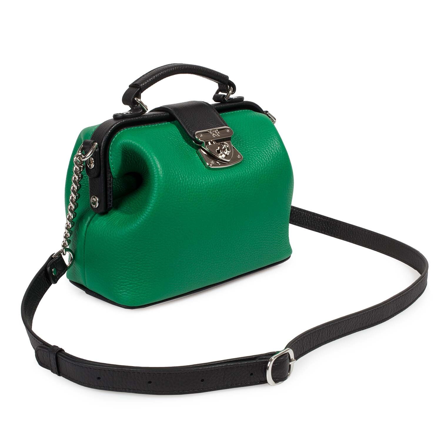 Women's leather bag made of genuine leather, hardware with galvanic coating and microfiber lining. The internal space of a bag is equipped with three spacious compartments and two patch-pockets and one zipper pocket. Closes with 2 buttons magnet. The bottom of the bag is protected with metal legs. The kit also includes a storage bag.