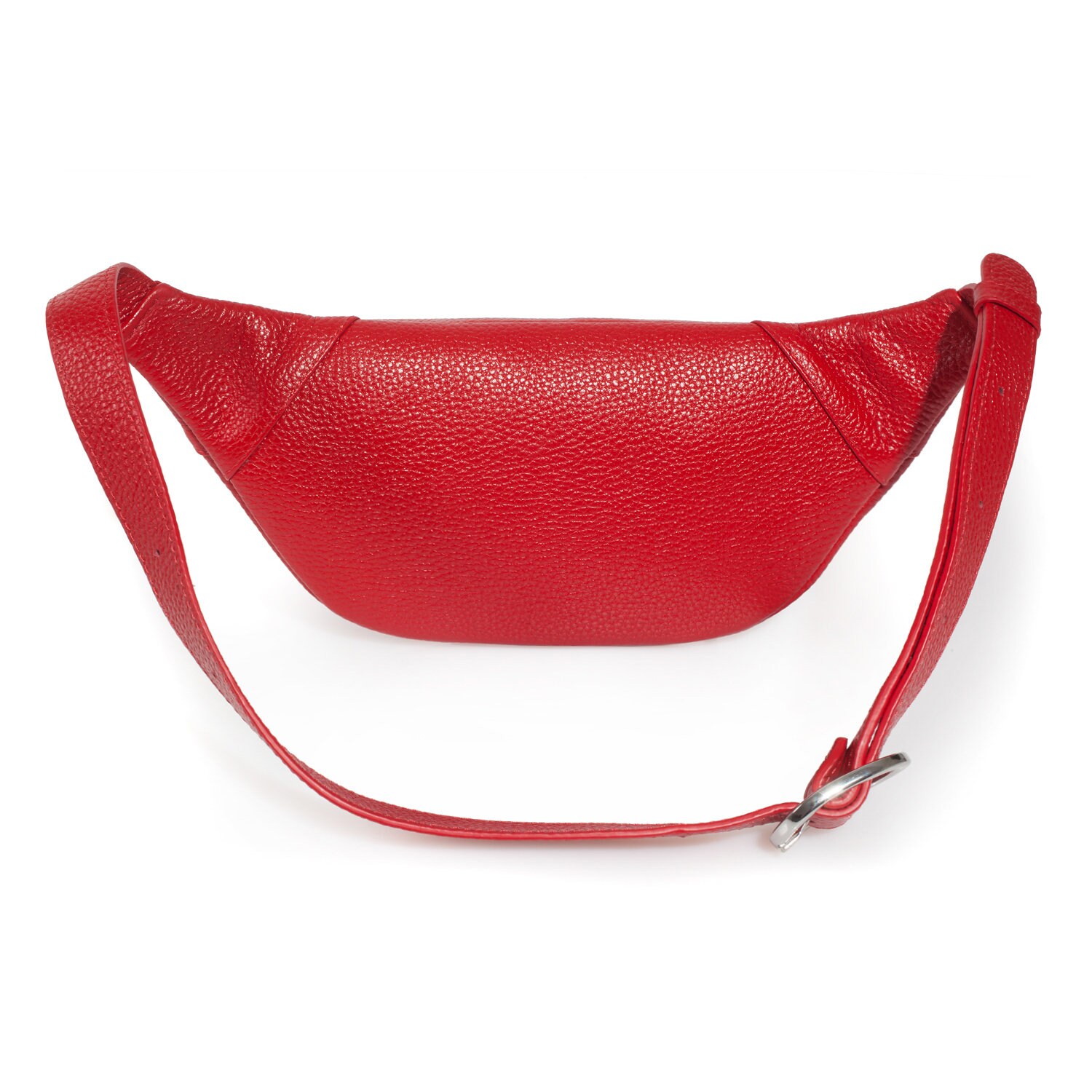 Red genuine leather woman bananka bag from ukrainian designer Katerina Fox. Fashionable and elegant modern bag KF for bright girls and women. This bag is able to attract attention and highlight your exquisite taste. Inside the bag is one large compartment and a convenient zippered pocket for small items, closes the bag on the zipper.